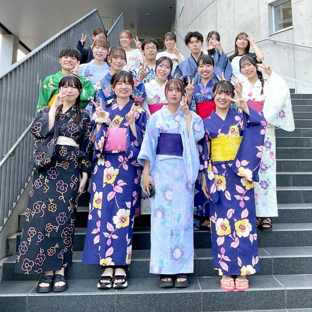 学生たちは、授業の中で制作した浴衣を着用し、同じ浴衣地でも柄合わせや帯次第で全く異なる装いになるという発見など、着用体験としても貴重な機会となりました✨