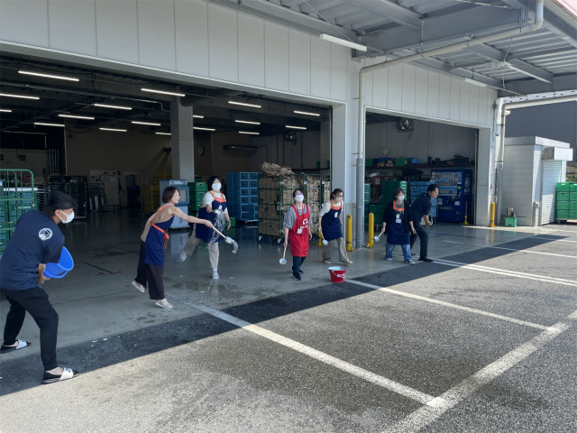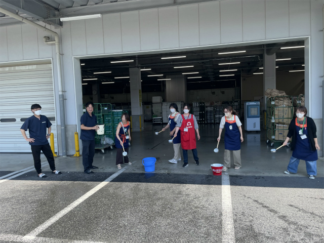 《感想:12時現在35度と猛暑の中打ち水を実施しました。冷凍蓄冷材専用庫の排水をバケツにため使用。35度の猛暑の中でも打ち水をしたことにより、多少体感気温が下がった実感がありました。取組み目的も参加従業員への理解が深まりました。》